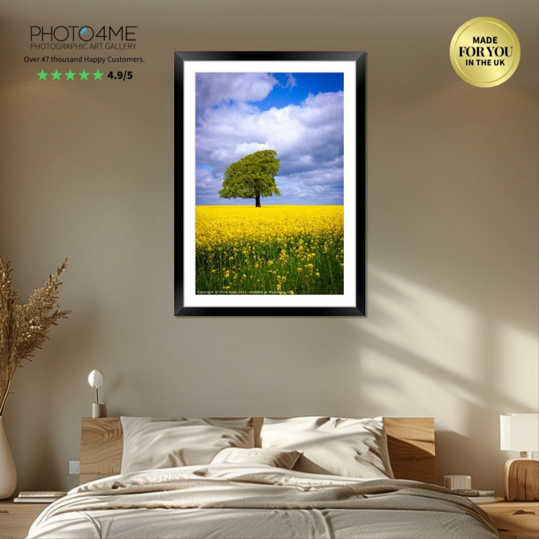 A single tree in a field of vibrant yellow oil seed rape in summer sunshine near Tetbury in the Cotswolds, Gloucestershire, UK