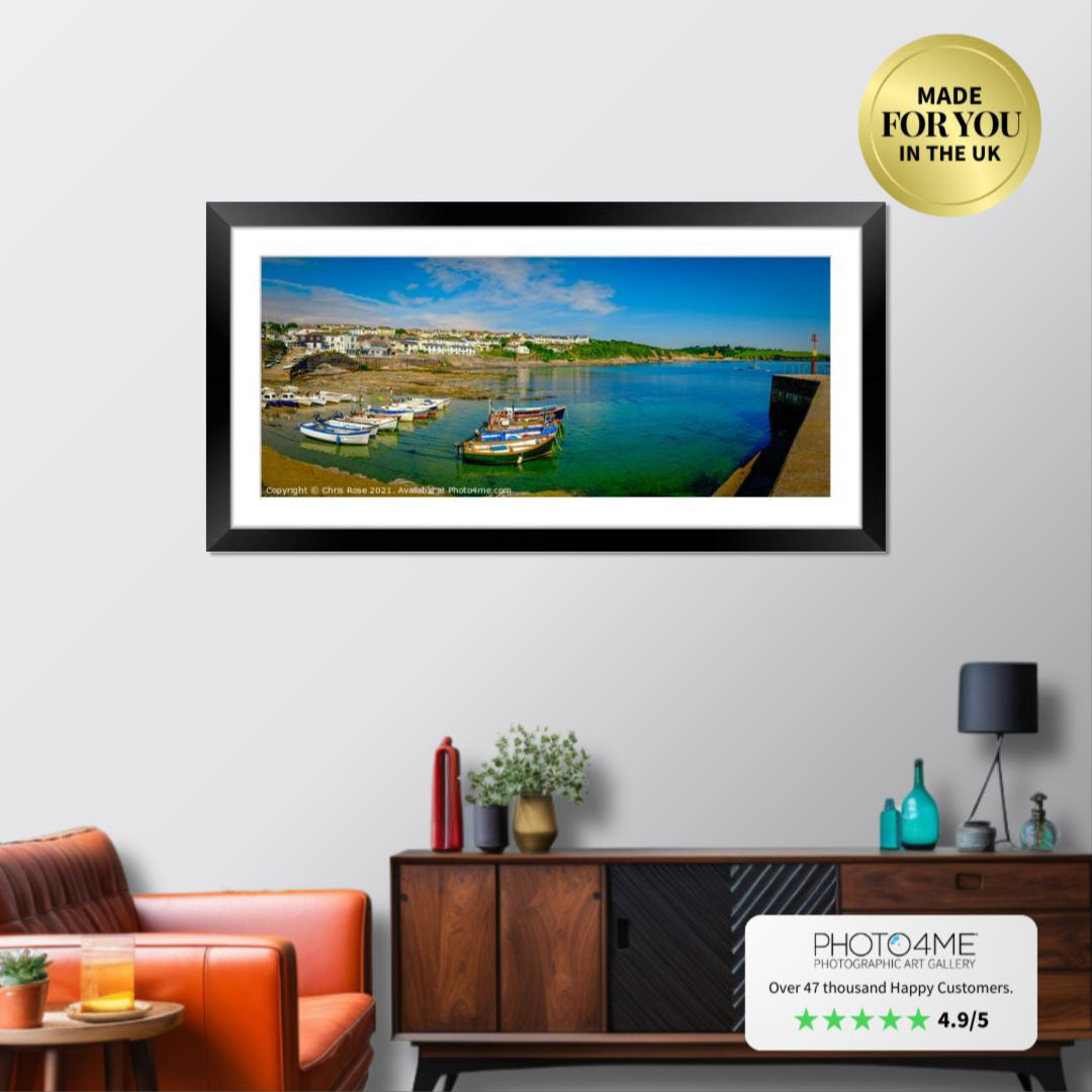 Holidaymakers enjoy the vibrant blue waters of the harbour beach at Portscatho, Cornwall, UK on a beautiful summer morning.