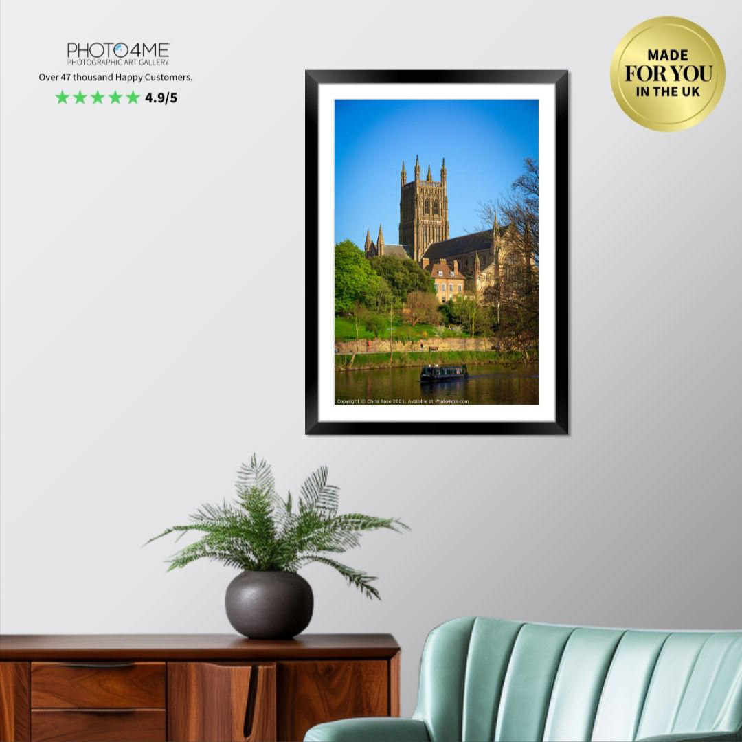 Cathedral with canal boat passing, River Severn, Worcester, Worcestershire, England, UK, Europe