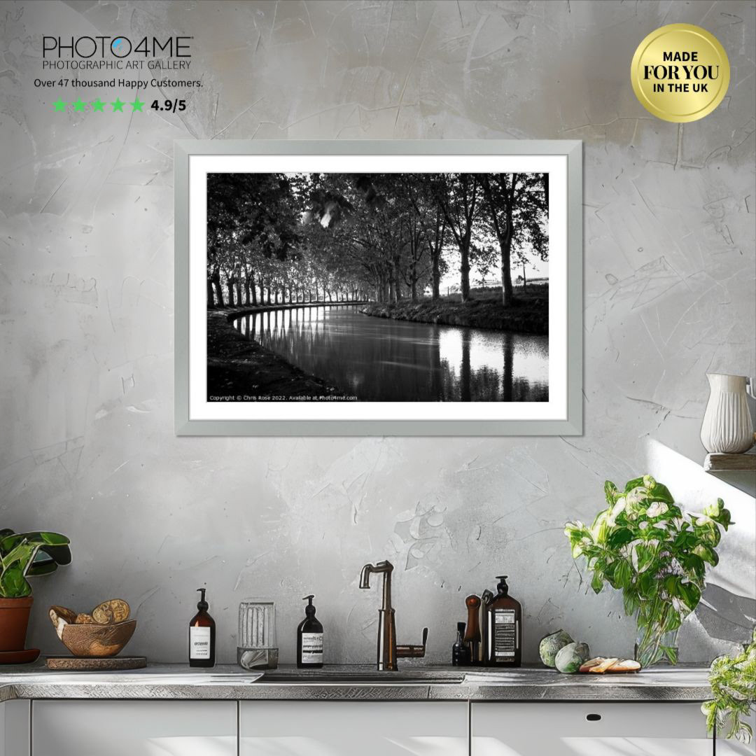 The tree lined canal Canal du Midi at Capestang, Herault, France, black and white