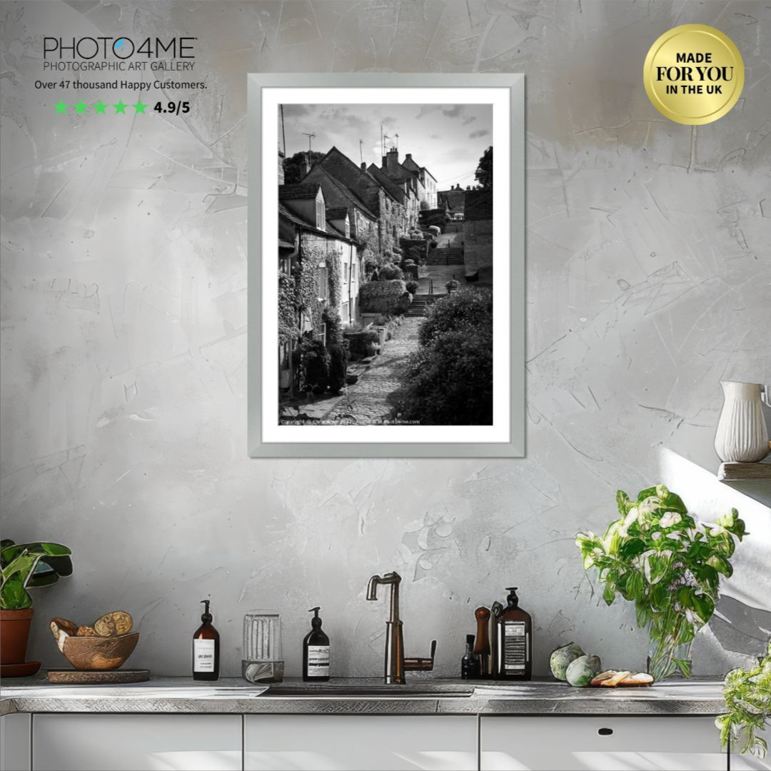 The picturesque old cottages of The Chipping Steps, located in the beautiful town of Tetbury in Gloucestershire, United Kingdom. The black and white effect adds a timeless quality to this stunning location in the Cotswolds.