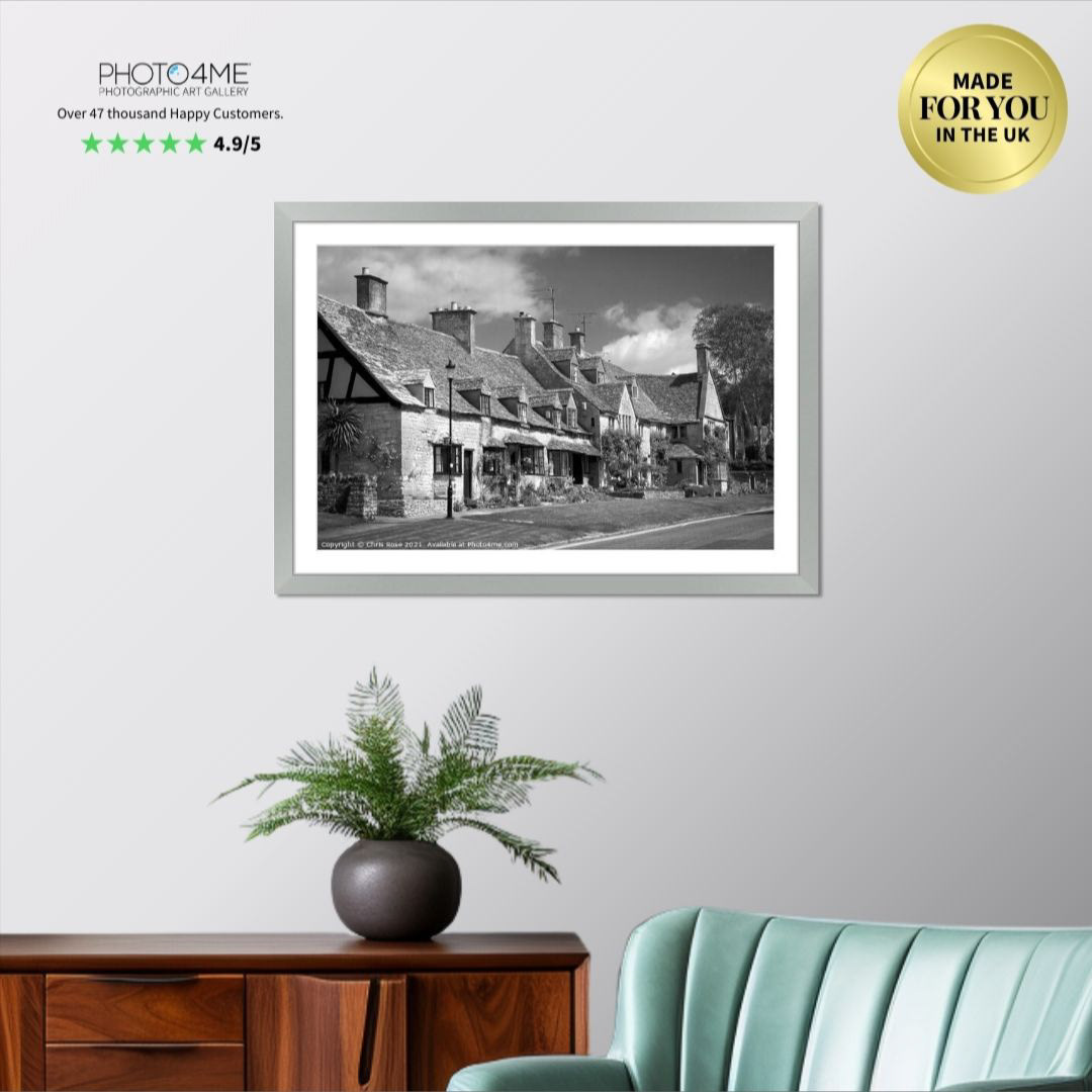 A row of pretty stone cottages in Broadway, Worcestershire, Cotswolds, UK, black and white