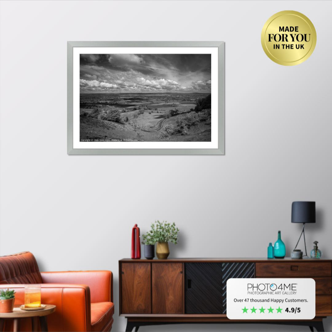 Coaley Peak viewpoint. The view over The Severn Vale from the Cotswold escarpment near Nympsfield, Gloucestershire, UK in black and white.