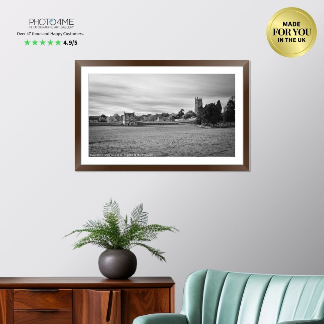 Historic Chipping Campden architecture viewed across the fields, Gloucestershire, Cotswolds, UK in black and white.