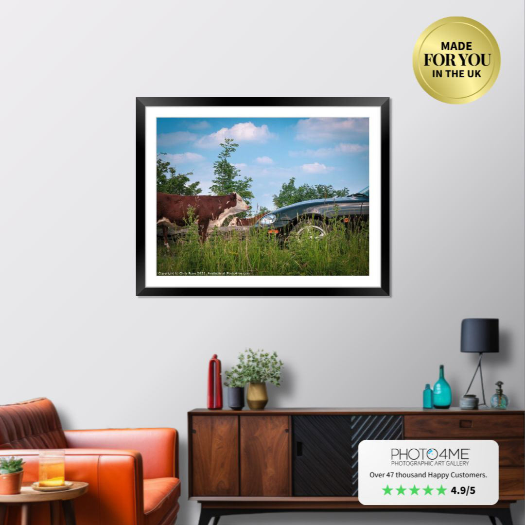 A cow stands in the road blocking traffic. Cattle roam freely on the roads over Minchinhampton Common in the Cotswolds, Gloucestershire, UK