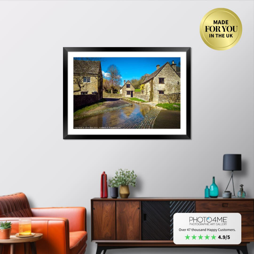 Picturesque Cotswold cottages cluster around the Dunt Stream ford in spring sunshine, Duntisbourne Leer, Cotswolds, Gloucestershire, UK