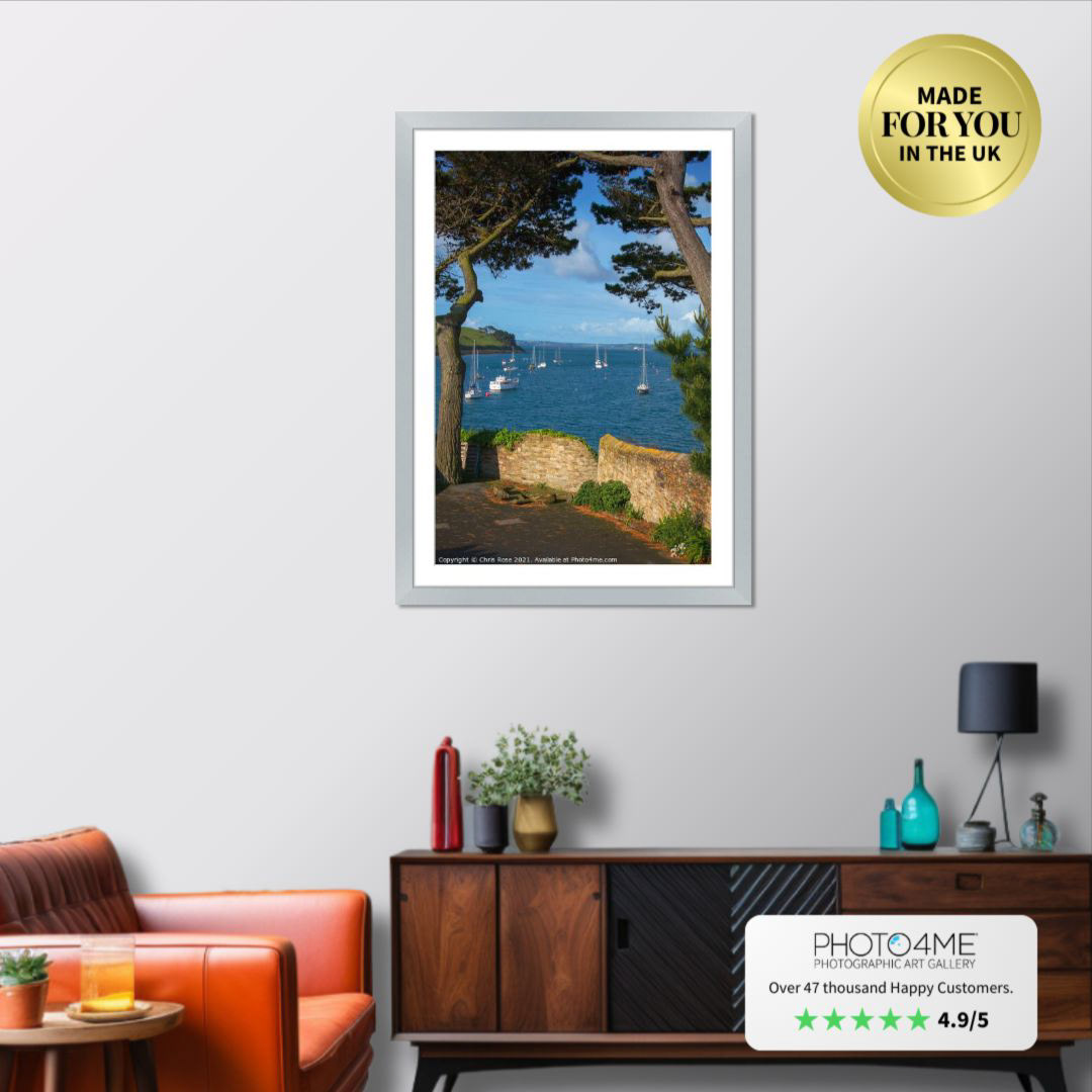 Moorings view framed by trees in St Mawes, Cornwall, England, UK