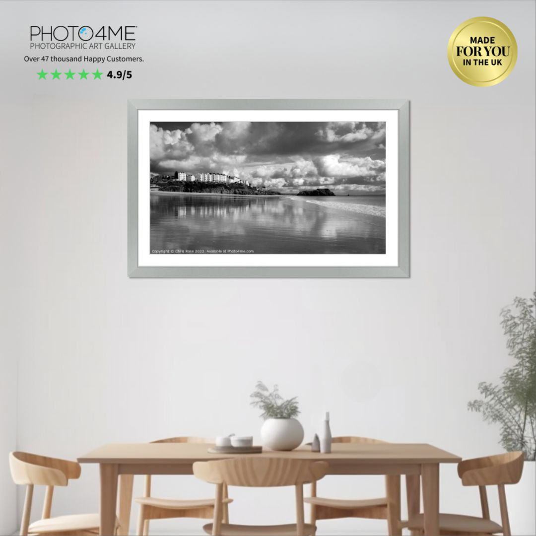 View towards Tenby reflected in the wet sand of South Beach, Tenby, Pembrokeshire, Wales, UK. Black and white.