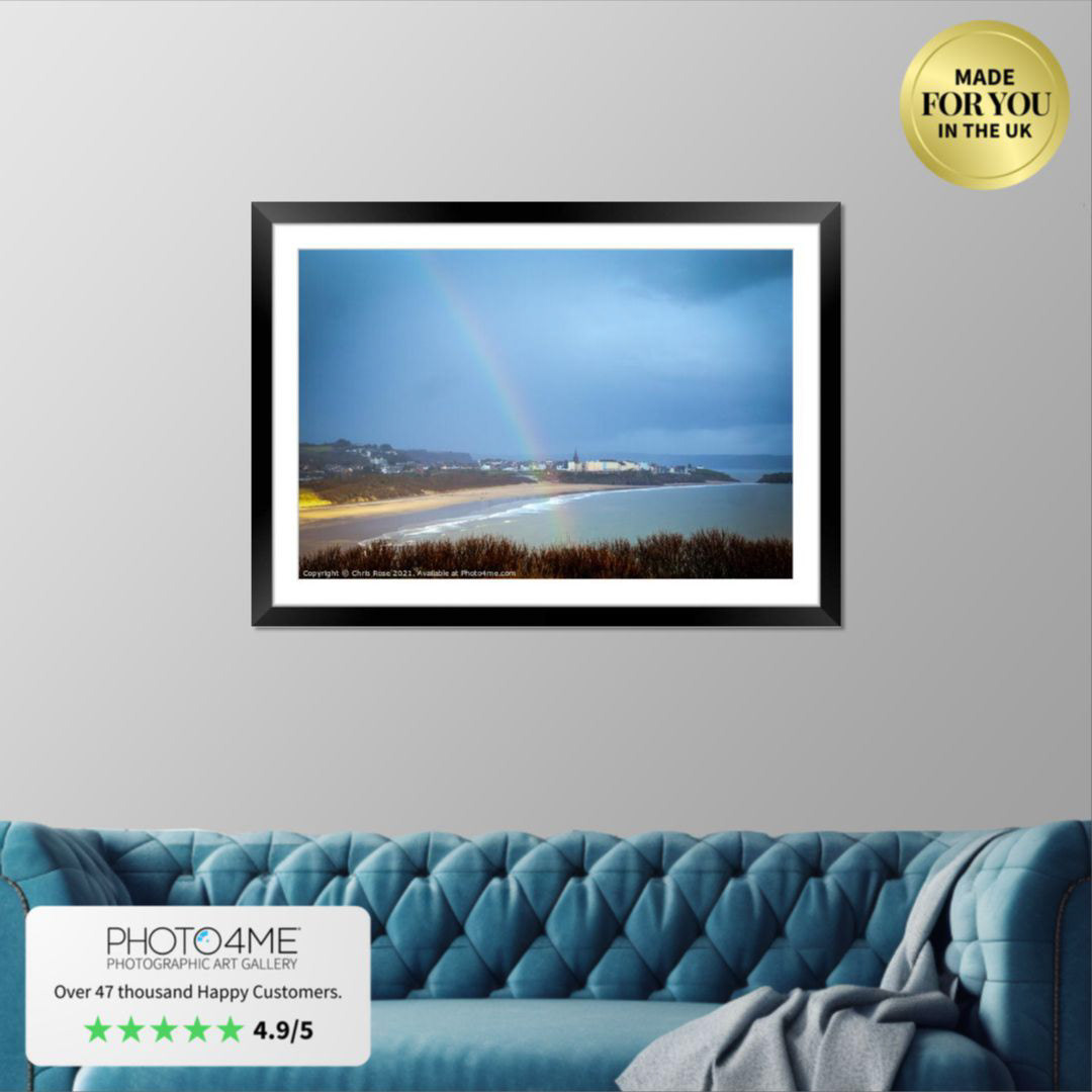 Winter sunshine and a real rainbow in the view over South Beach looking towards Tenby town, Pembrokeshire, UK