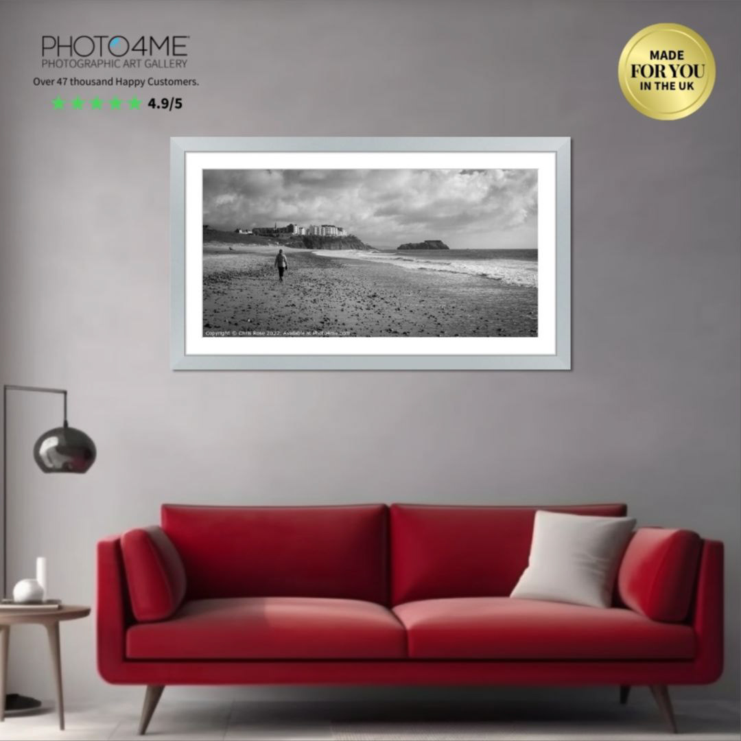 A woman walks her dog back along South Beach towards Tenby, Pembrokeshire, Wales, UK. Black and white.